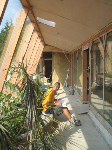 The Eco-Cements were mixed with local chalk aggregates (1 OPC, 2 MgO, 9 Aggregate Eco-Cement Concrete) to construct the floors and make some of the mortars holding a rear tyre bank wall. The builders also used the same mix as a mortar for bottle walls and other minor works. According to the builders, Eco-Cement mixes were easy to work with, stiff yet pliable and workable. Because Eco-Cements set by absorbing CO2 they are much greener ((See http://www.tececo.com/simple.eco-cement.php).