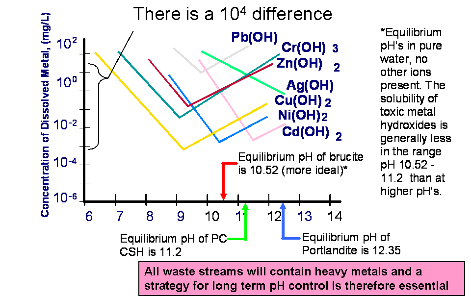 [9] Heavy metals tend to exist as hydroxides and one of the advantages of TecEco cements is that the pH is controlled by Brucite and CSH and somewhere in the range between the equilibrium pH's of these two components of concrete which are 10.48 and around 11.2 respectively and closer to the minimum solubility of most heavy metals other than silver