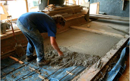 Eco-Cement Floor Showing Placement, Partial Completion and Final Tiling.