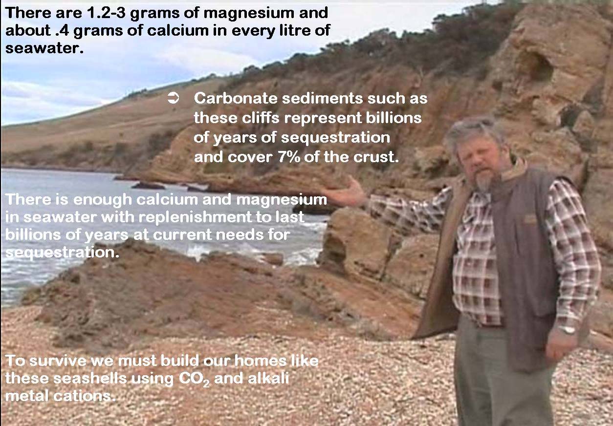 John Harrison Explaining how we must Mimic Nature by Using CO2 to Build with (just like the seashells on the beach beneath his feet the fossil remains of which make up the cliffs behind him)